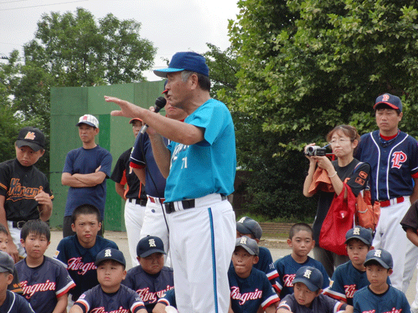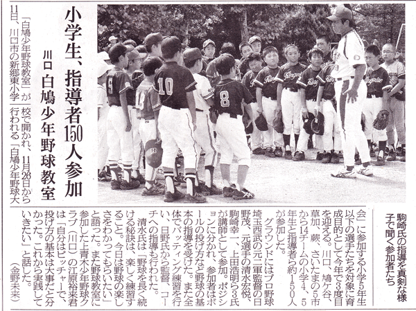白鳩少年野球教室を小学生、指導者総勢150人、川口市新郷東小学校で行いました。 小学校5年生以下の選手を対象に川口、鳩ヶ谷、草加、蕨、さいたまの5市から14チームの小学4、5年生が参加。ポジションに分かれ、ボールの投げ方などの野球の基本からバッティング練習まで教室を行いました。